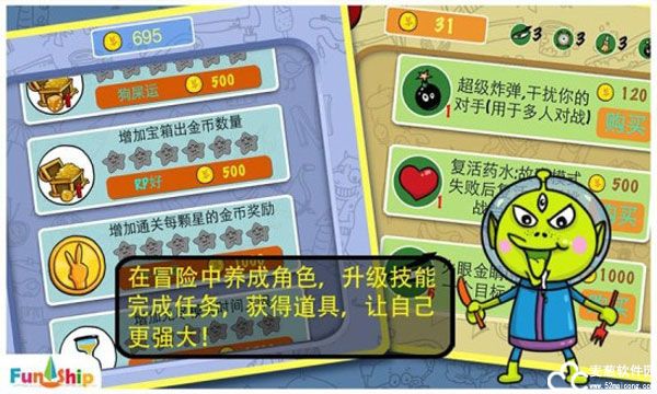故事冒险模式:四个不同的世界进行冒险,体验不同的幽默故事,完成不同任务,世界的尽头还有Boss等着玩家去挑战。还能升级角色,赢得各类奖励。