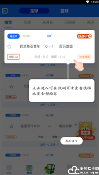 1、大家在麦葱站下载软件打开后,首页会有很多精彩赛事推荐,而点击直播大厅会看到当天所有正在直播的比赛,点击即可进入播放。
