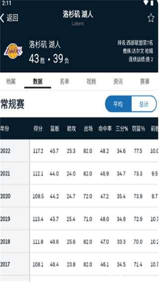 4、比如我想看湖人队,那么就可以看到历年来的常规赛、季后赛数据一览。