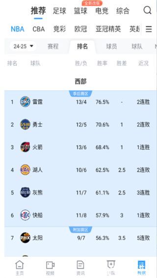 4、在数据板块,还可以轻松查询当下东西部所有球队的排名信息以及相关数据。