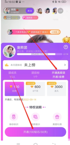 3、大家首先需要开通真爱团,需要花费一定的钻石,这是需要充值的,而且有一定的时间限制。