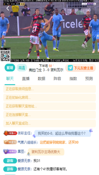 3、在播放页面可以发送弹幕和球迷朋友们实时互动,也可以随时查看球员数据。