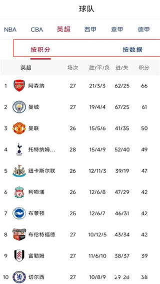 3、在球队板块,我们可以按积分或者数据对每支球队进行排名,以下是英超各路豪强排名。