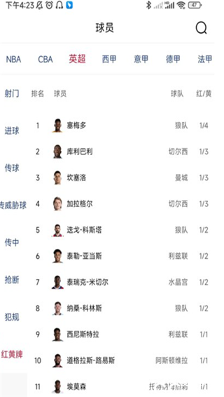 5、在球员板块,还可以看到当下进球、传球、抢断最多的球员统计。