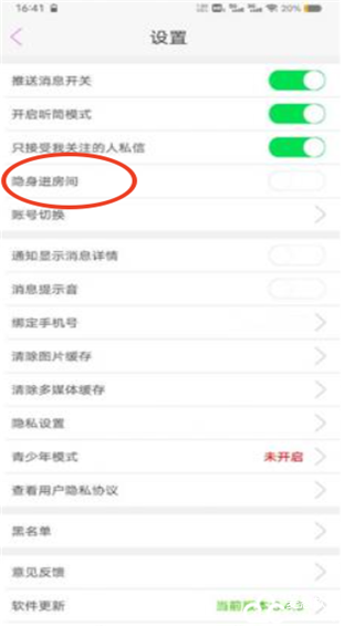3、将【隐身进房间】选项打开即可,就没有人能够看到你了。