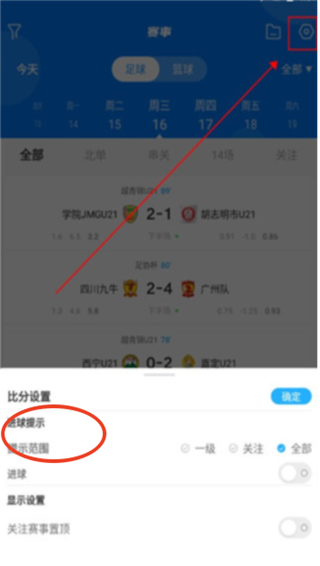 3、如果大家没空看直播的话,我们可以打开设置板块,将进球提醒打开,这样一有进球你就能第一时间知道,随时关注比赛战况。