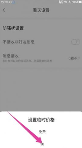 3、我们可以在这里设置聊天的临时价格,有免费的,或者需要支付虚拟币的。