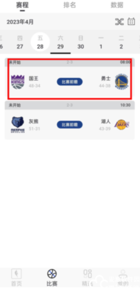 2、这里会罗列出当天所有的比赛内容,我们看到今天有两场比赛,国王对勇士以及灰熊对湖人,挑选你想看的直播。