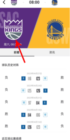 3、比赛还没开始,我们可以先看看两队近期的表现,点击国王队。