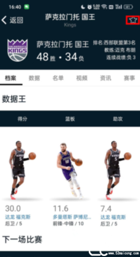 4、如果你比较喜欢国王队的话,可以点击右上角的小星星,即可预约这场比赛,比赛开始前会第一时间通知你。