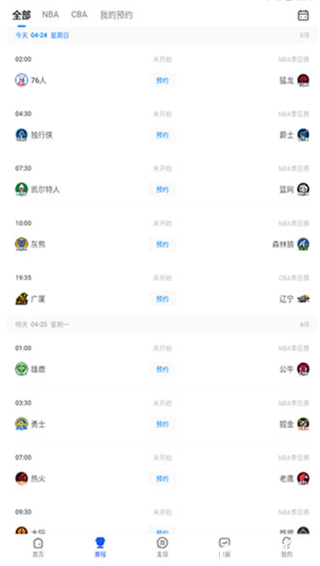 2、如果想看比赛的话,点击赛程,有时下最热的NBA、CBA精彩赛事转播,以及录像回放。