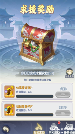 通过宗门援助功能可向宗门成员求助自己需要的对应阵营5星修士碎片,也可以对有需要的宗门成员进行援助,每天有2次求助次数和10次援助次数,免费援助次数用完后可使用仙玉援助。