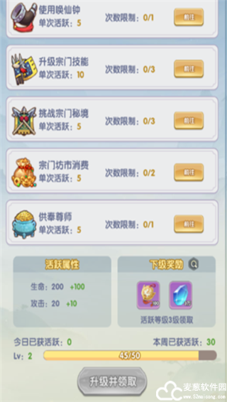 每日完成宗门活跃任务可以获得活跃度奖励,可获得大量宗门贡献和灵石等奖励。