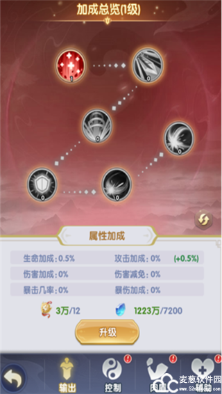 可消耗宗门贡献和灵石分别升级输出/控制/肉盾/辅助四大职业的各项技能属性。