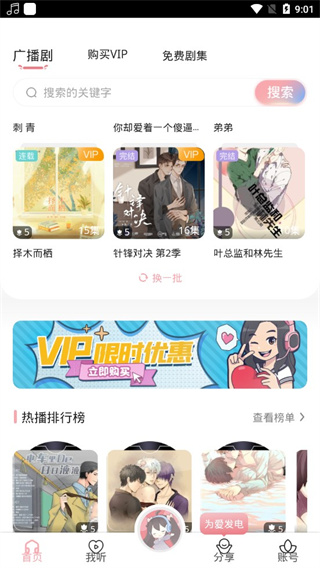 1、首先大家进入软件,在首页有大量热门的广播剧可以收听,大家可以根据自己喜欢的进行选择。