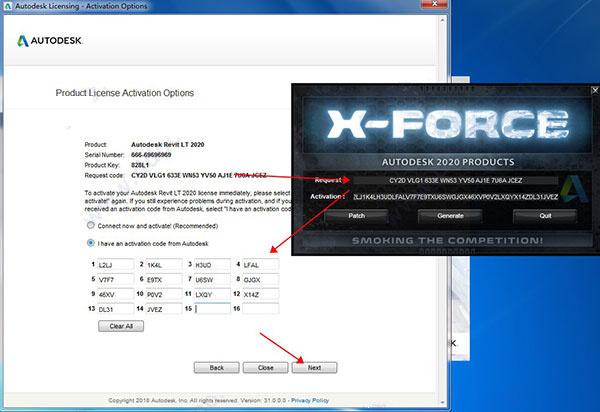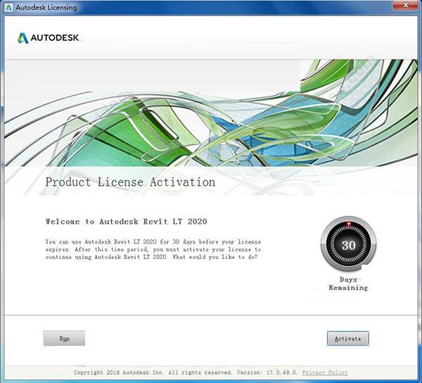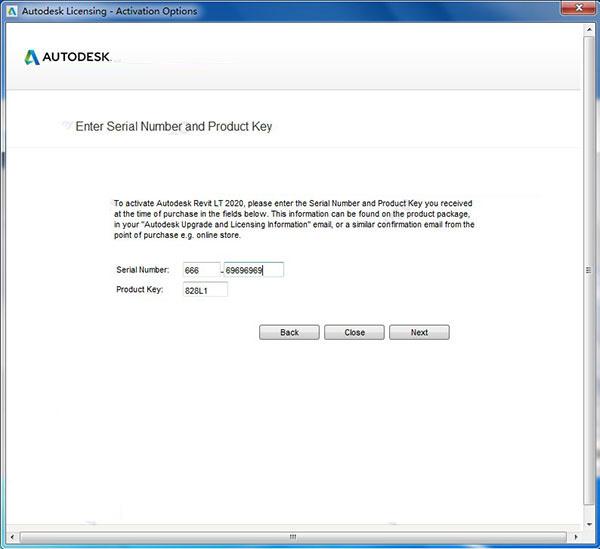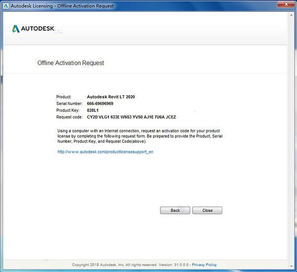 8.重启程序,再次进入软件,将Request信息复制到注册机中,点击Generate按钮将生成一组注册信息,然后将其复制到AutoCAD Revit LT 2020的注册框中