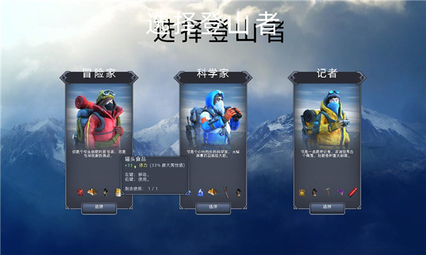 孤山难越是由ByteRockers' Games制作发行的独立Rogue冒险游戏,游戏里面有三种真实身份:探险家、生物学家和新闻记者供用户挑选。每一个人物的技能和游戏道具也不一样。例如,探险家的技能是迅速运作,挪动全过程中的時间耗费会降低,人体体温也会提升。他带上的登山游戏道具是攀登手套;生物学家的独家代理技能是鹰眼侠。在下一次挪动以前,它将提升画面调整图片大小,进一步提高用户的视线。另一项技能是剖析。每每生物学家应用此项技能时,他便会得到工作经验。他应用的登山游戏道具是春游拐仗和皮毛手套;新闻记者的技能是一根肌腱。应用此技能将忽视气温和地貌实际效果。不过游戏自身不兼容简体中文版,于是小编就带来了这款